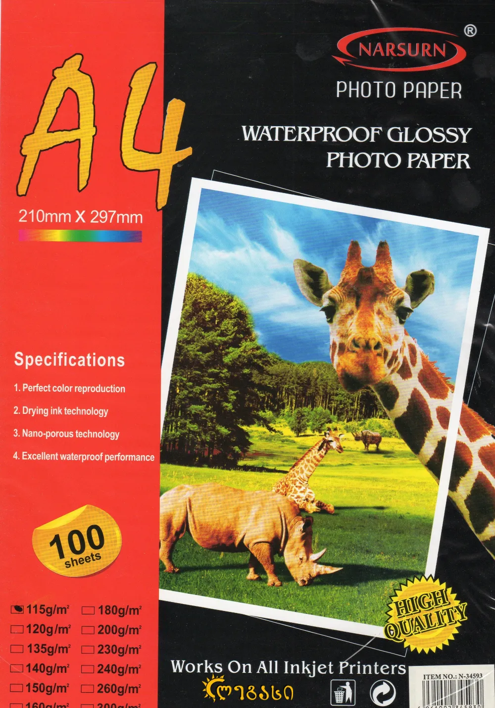 ფოტო ქაღალდი ა-4 ერთმხრივი 100-ც. 115-გრ. WATERPROOF GLOSSY PHOTO PAPER 115 G/M
