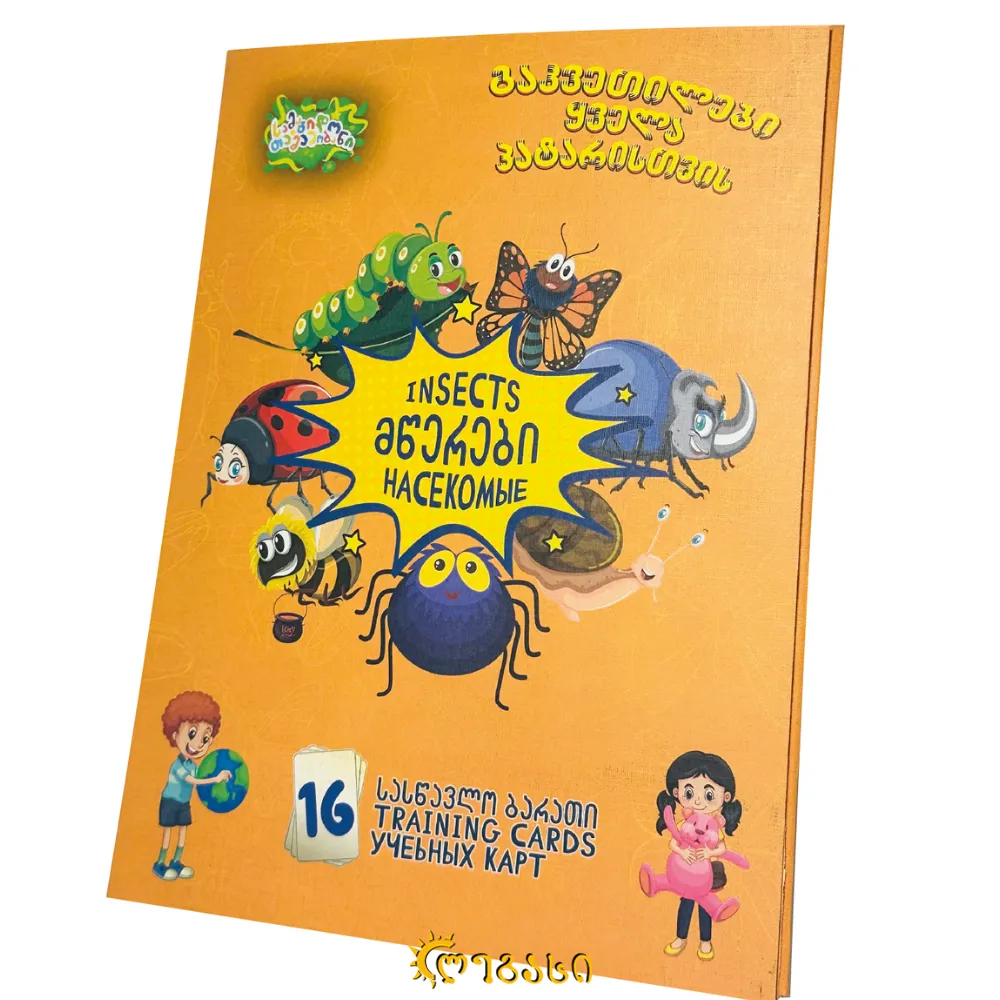 მწერების სასწავლო ბარათები არის შემეცნებითი ნაკრები, რომელიც ბავშვებს ეხმარება გაიცნონ სხვადასხვა სახის მწერები, მათი მახასიათებლები და როლი ბუნებაში. თითოეულ ბარათზე წარმოდგენილია ილუსტრაცია და მნიშვნელოვანი ფაქტები კონკრეტული მწერის შესახებ, რაც სწავლას უფრო საინტერესოსა და შემეცნებითს ხდის და პატარებში ბუნებისადმი ინტერესს აღძრავს.