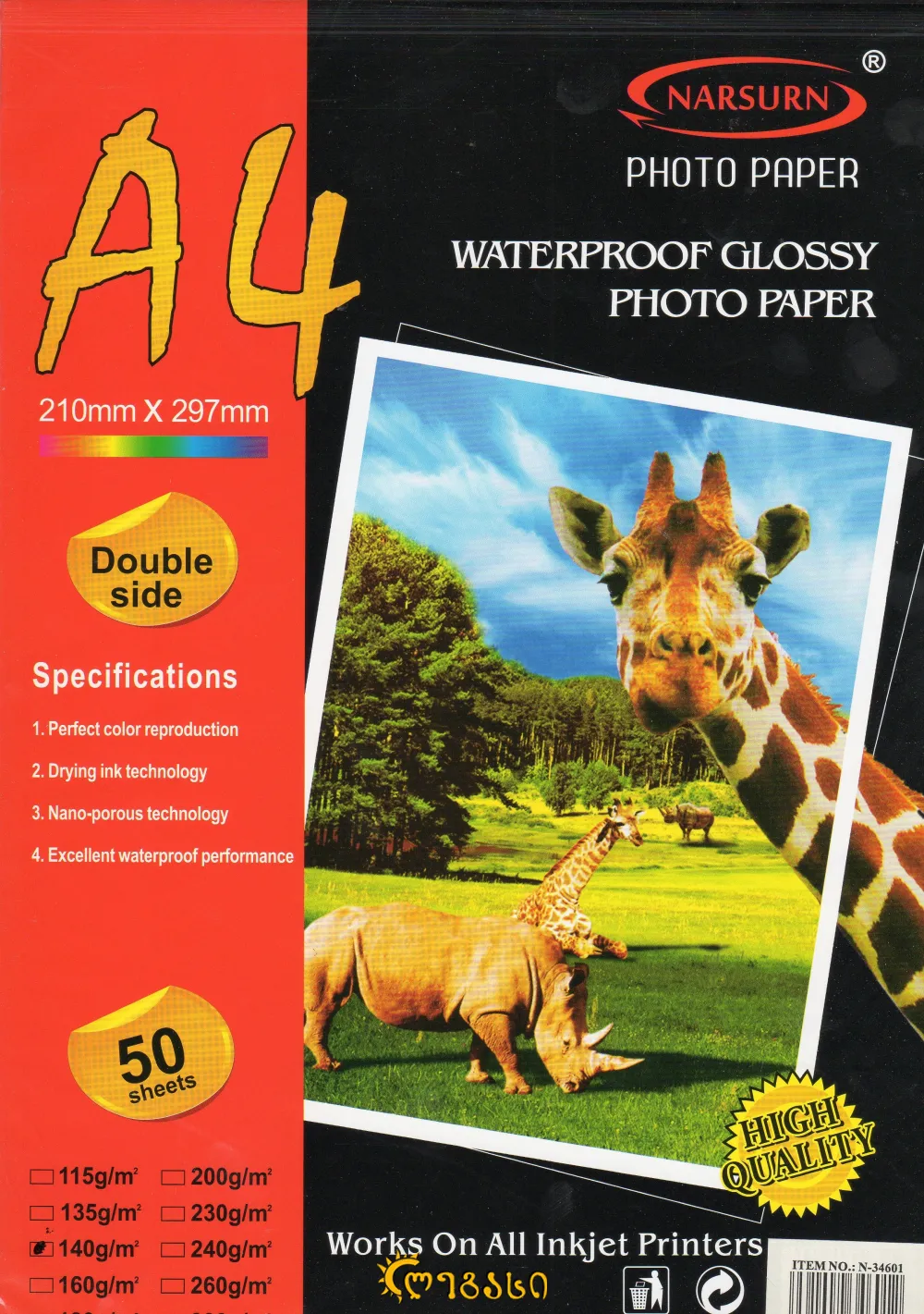 ფოტო ქაღალდი ა-4 ორმხრივი 50-ც. 140-გრ.WATERPROOF GLOSSY PHOTO PAPER DOUBLE SIDE 140 G/M