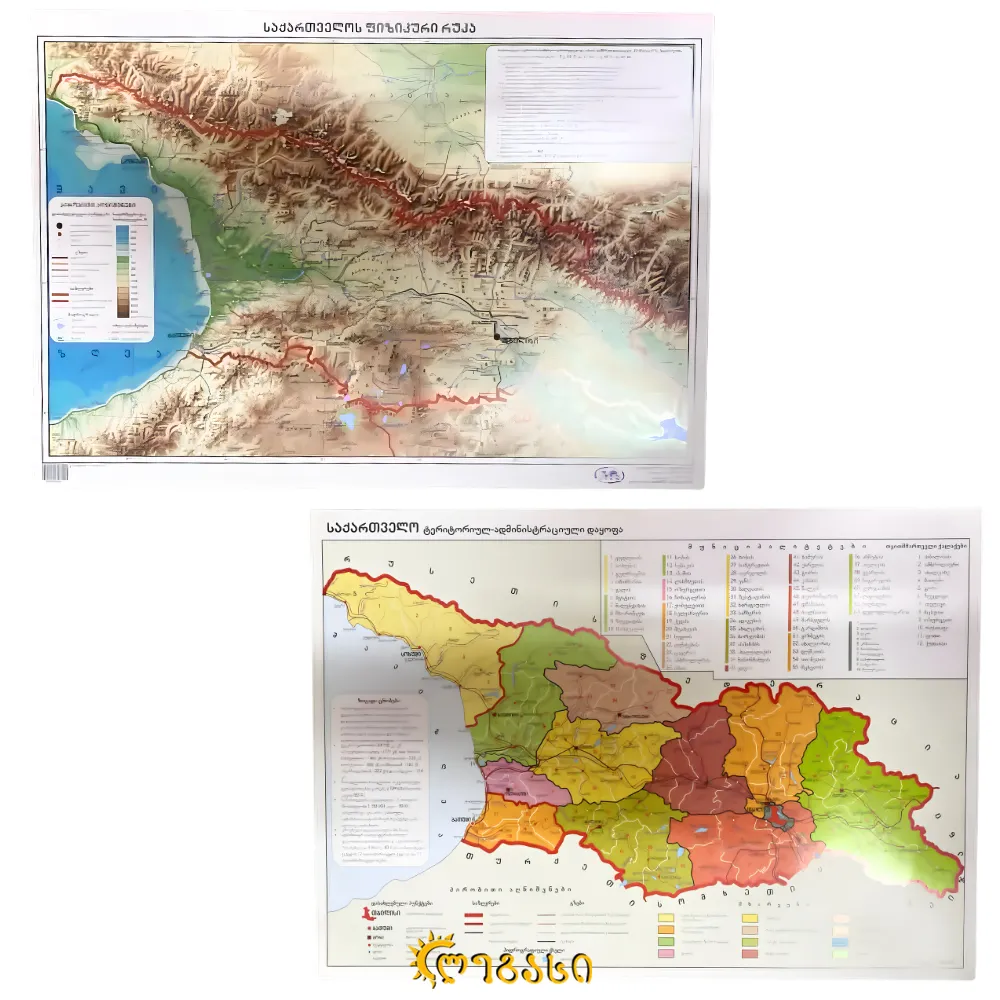 რუკა A3 ევროპის პოლიტიკური რუკა + ევროპის ფიზიკური რუკა - საქართველოს ტერიტორიულ-ადმინისტრაციული რუკა + საქართველოს ფიზიკური რუკა