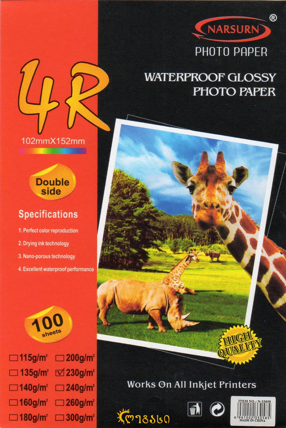 43001 ფოტო ქაღალდი 10X15 ორმხრივი 230 გრ WATERPROOF GLOSSY PHOTO PAPER DOUBLE SIDE 230 G/M