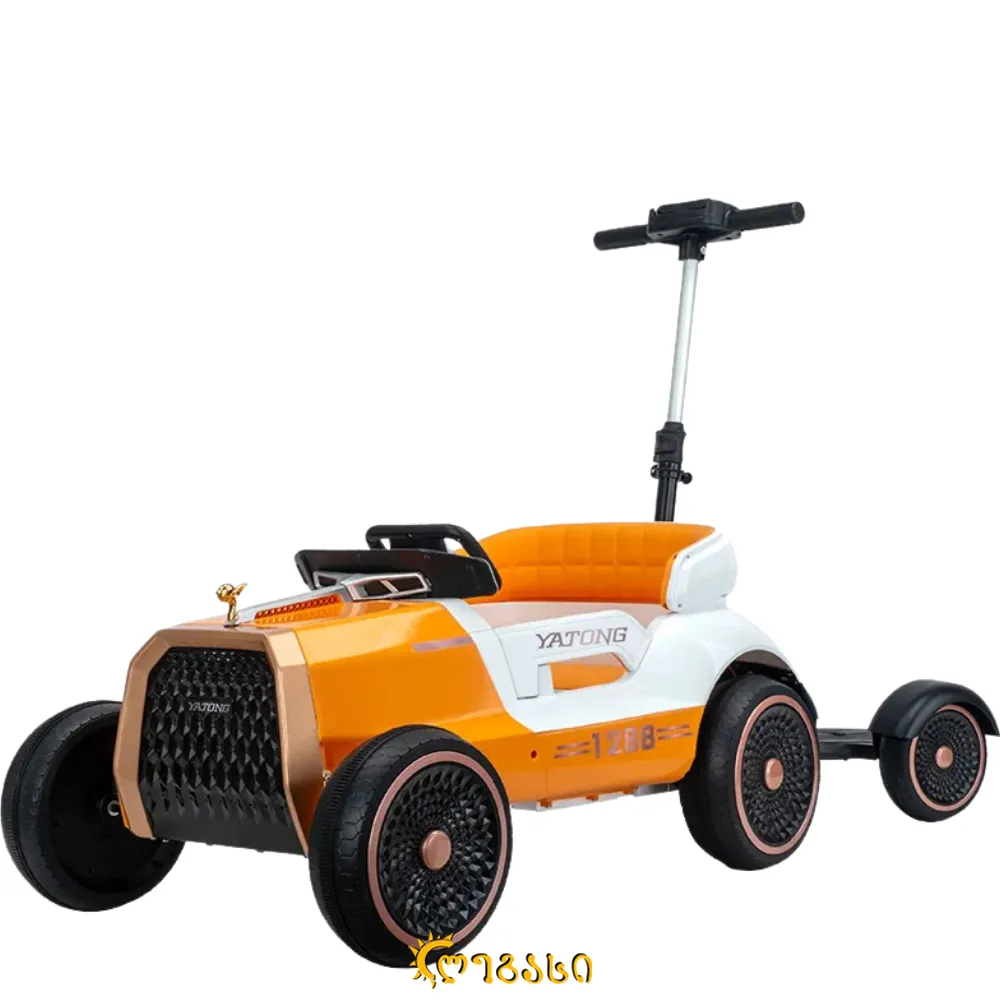 ელექტრო სათამაშო მანქანა ბავშვებისთვის, რომელშიც მოზრდილსაც შეუძლია დაჯდომა. აღჭურვილია რეგულირებადი სახელურებით და დისტანციური მართვით.