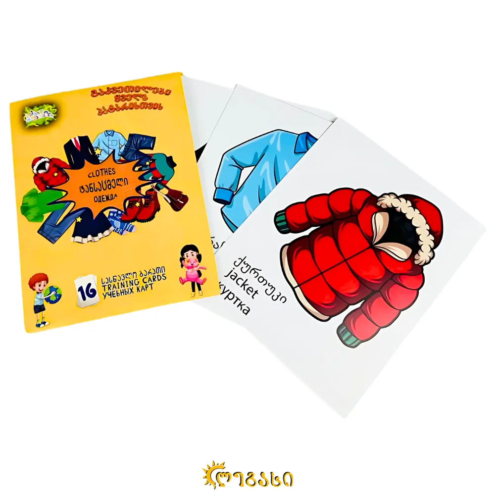 ტანსაცმლის სასწავლო ბარათები არის სახალისო და შემეცნებითი საშუალება, რომელიც ბავშვებს ეხმარება სხვადასხვა ტიპის ტანსაცმლის, მათი სახელებისა და დანიშნულების გაცნობაში. თითოეულ ბარათზე გამოსახულია ტანსაცმლის ილუსტრაცია და დასახელება, რაც ხელს უწყობს პატარების ლექსიკის გამდიდრებას და ყოველდღიური ნივთების უკეთ შემეცნებას.