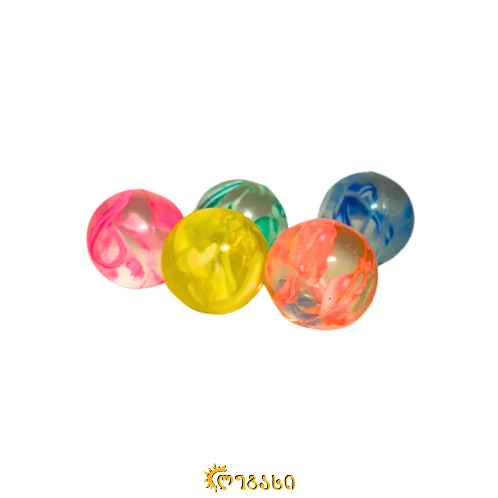 კაუჩუკის ფერადი ბურთები, ხუთ სხვადასხვა ფერში.