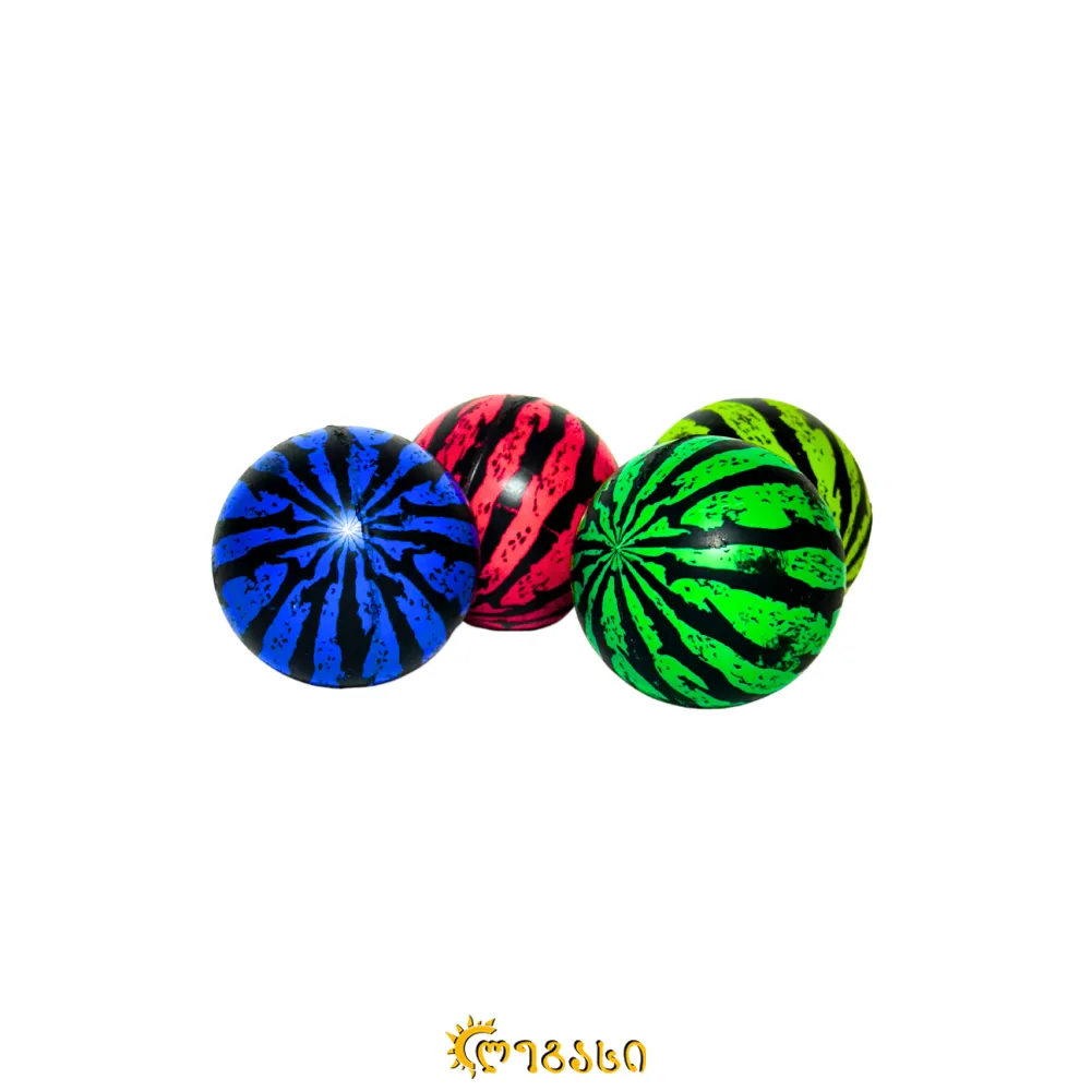 კაუჩუკის ფერადი ბურთები, საზამთროს დიზაინით. ოთხ სხვადასხვა ფერში.